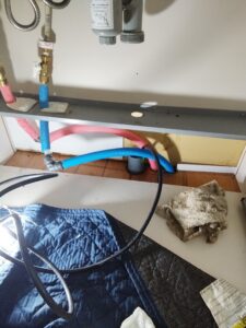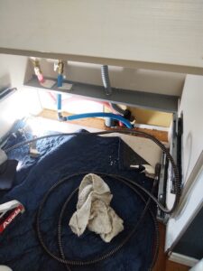 今回は排水管内部にドレーンクリーナー(ワイヤー)を入れ、詰まりの原因を砕き、その後高圧洗浄機を使用し詰まりの原因を除去しました。