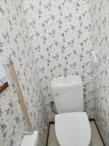 今回の作業内容は、新築から長年お使いのトイレ器具を1・2階共に交換と、内装壁紙・床クッションフロアー貼替え・手摺設置・紙巻2連交換を行いました。