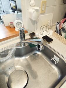 台所のシャワーホースが切れて水漏れが発生しており、タンクが満タンとなってしまっています。