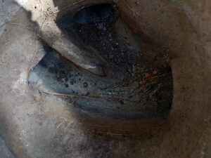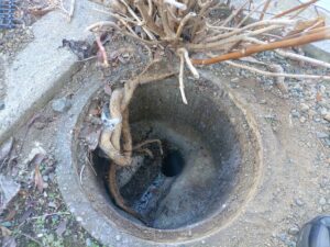 トイレの詰まりの原因確認をするために、敷地内に設置されている排水桝の蓋を全て開けてみると、バスの中まで根っこが侵入していました。